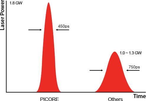 Picore is een picoseconde Nd:YAG Laser met een unieke optische gepatenteerde technologie bestaande uit drie laserkamers om een hoog piekvermogen van 1,8 GW te bereiken en een energie-output tot 800 mJ te leveren in ultrakorte pulsen van 450 pk.