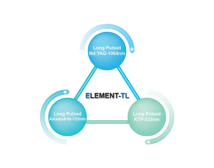 Triple Long Pulsed Laser Elemenic’s ELEMENT-TL is een Premium Long Pulsed Laser met drie golflengten (Alexandrite+Nd:Yag+KTP) in één machine. Door KTP-532nm toe te voegen aan het vorige Dual Laser-systeem (Nd:Yag-1064nm, Alexandrite-755nm), zijn de economie, ruimte en bruikbaarheid verbeterd. Ontdek de veelzijdigheid van ELEMENT-TL