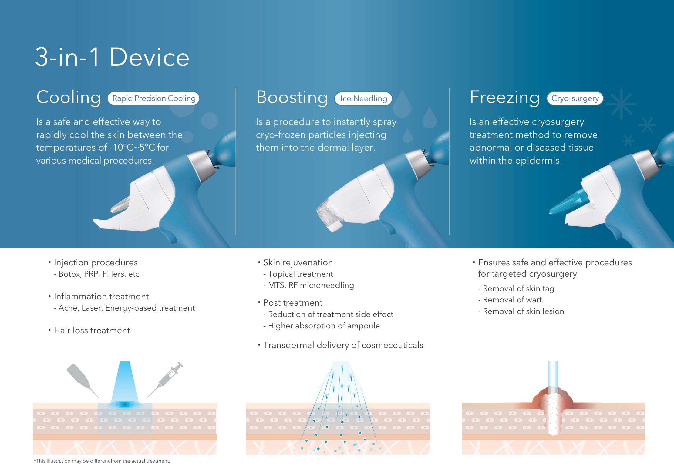 Vermindert ongemak tijdens esthetische of medische behandelingen door de huid te verdoven met koude lucht.